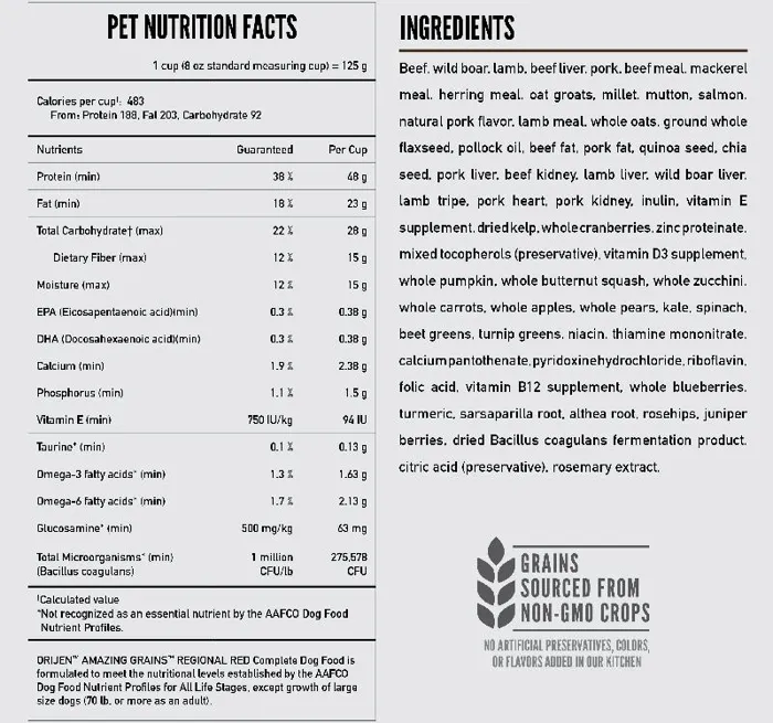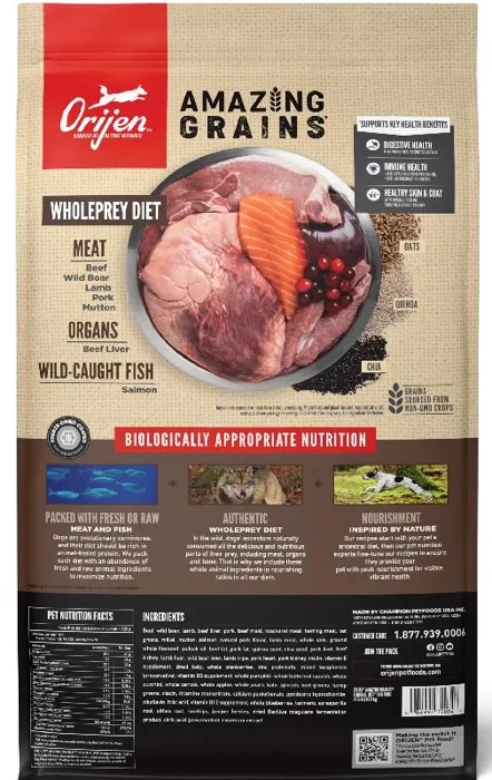 ORIJEN Amazing Grains is packed with fresh or raw animal protein and enhanced with hand-selected grains to give your dog peak nourishment. With 90%* premium animal ingredients, ORIJEN Regional Red with Amazing Grains includes WholePrey ingredients from beef, wild boar, goat, lamb and wild-caught mackerel. These nutrient-dense animal ingredients provide your dog with the protein, vitamins and minerals they need to thrive. This diet includes only the most amazing grains in a high-quality blend of oats, quinoa and chia and more, hand-selected to provide a balanced fiber ratio that helps support your dogโs digestive health.