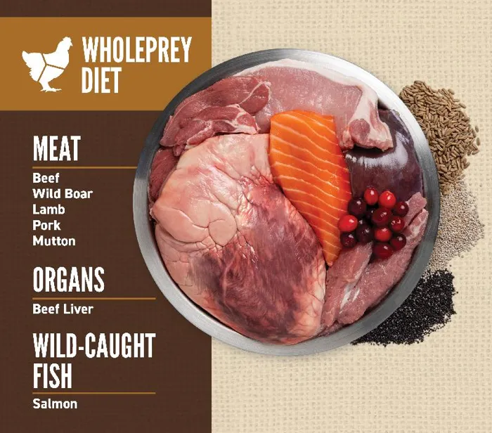 - Authentic WholePrey diet features the most succulent parts of the prey like meat, fish, organs and bone to mimic what your dogโs ancestors consumed in the wild.