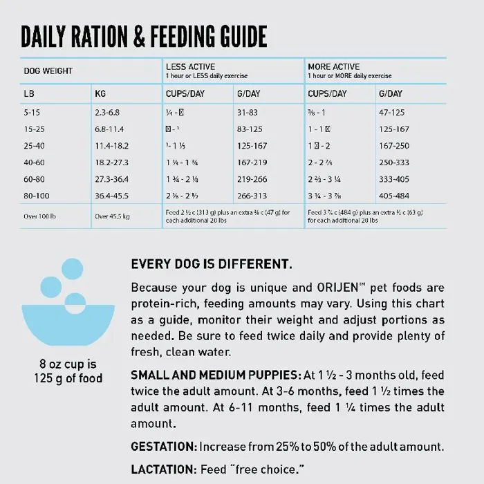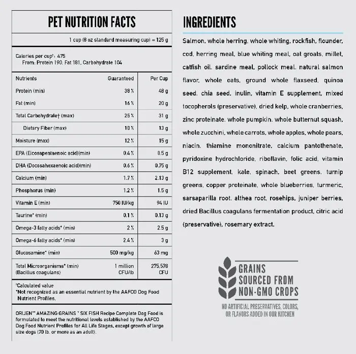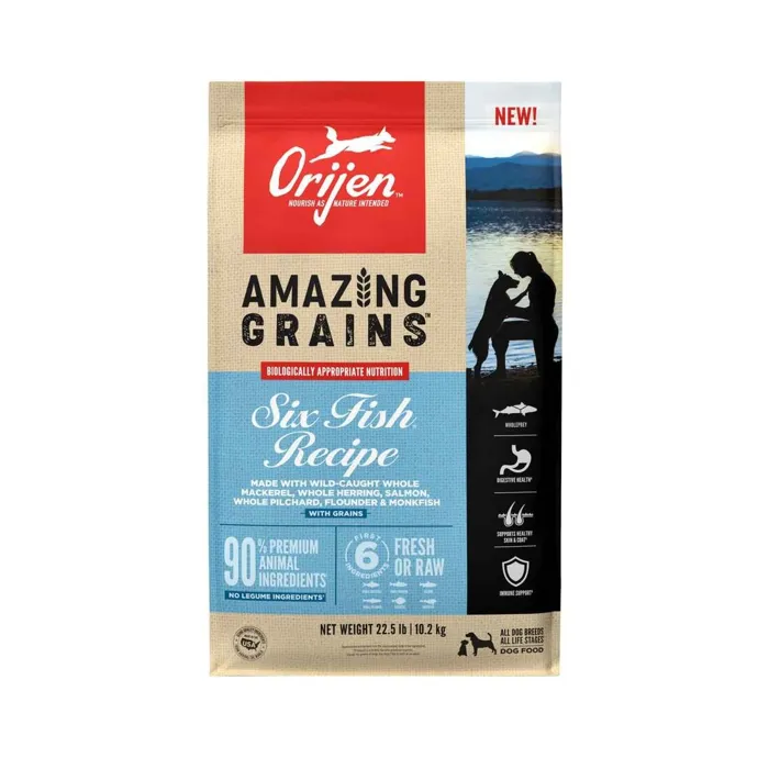 ORIJEN Amazing Grains is packed with fresh or raw animal protein and enhanced with hand-selected grains to give your dog peak nourishment. With 90%* premium animal ingredients, ORIJEN Six Fish with Amazing Grains includes WholePrey ingredients from wild-caught whole mackerel, whole herring, monkfish, acadian redfish, flounder and whole hake. These nutrient-dense fish ingredients provide your dog with the protein, vitamins and minerals they need to thrive. This recipe also contains only the most amazing grains in a high-quality blend of oats, quinoa, chia and more, hand-selected to provide a balanced fiber ratio that helps support your dogโs digestive health.