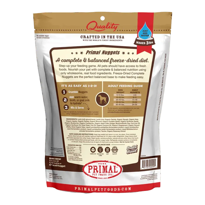 Primal Freeze-Dried Formulas are produced using only the freshest, human-grade ingredients. Our poultry, meat and game are antibiotic and steroid free without added hormones. We incorporate certified organic produce, certified organic minerals and unrefined vitamins to fortify our complete and balanced diets. All Primal Freeze-Dried Formulas contain fresh ground bone for calcium supplementation. This combination of ingredients offers optimum levels of the amino acids (protein), essential fatty acids, natural-occurring enzymes, and necessary vitamins and minerals that are the building blocks for your pet's healthy biological functions. All of the ingredients found in Primal Freeze-Dried Formulas are procured from ranches and farms throughout the United States and New Zealand that take pride in producing wholesome raw foods through natural, sustainable agriculture.