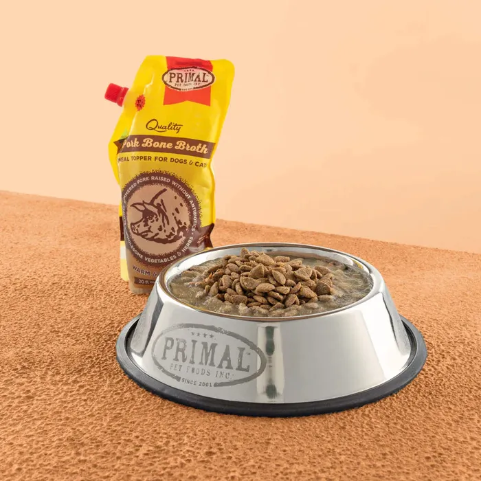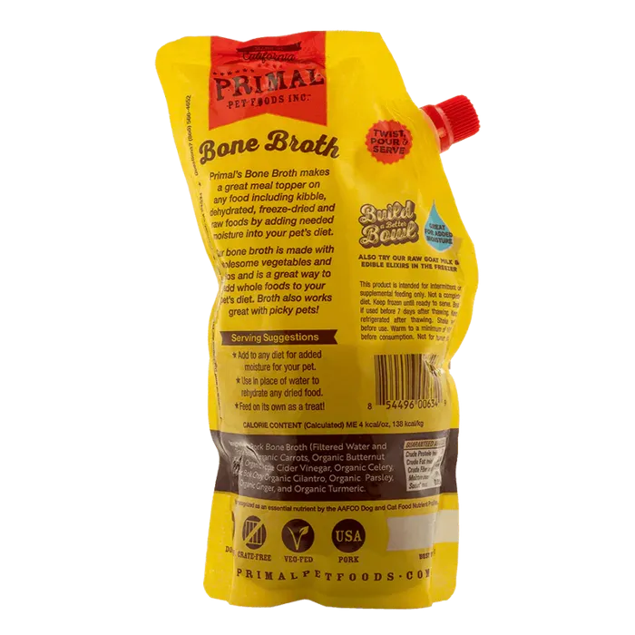 Bone Broth is a wholesome addition to any feeding regimen. When served on its own, added to commercial pet food, or along with any complete, balanced Primal Formula, Bone Broth adds necessary moisture and beneficial nutrients into your pet's diet. With key benefits including digestion and liver support, hydration and moisture, joint health, and more, supplementing with Bone Broth is an easy way to keep your pet hydrated and healthy. Primal Bone Broth is appropriate for dogs and cats at all stages of life.