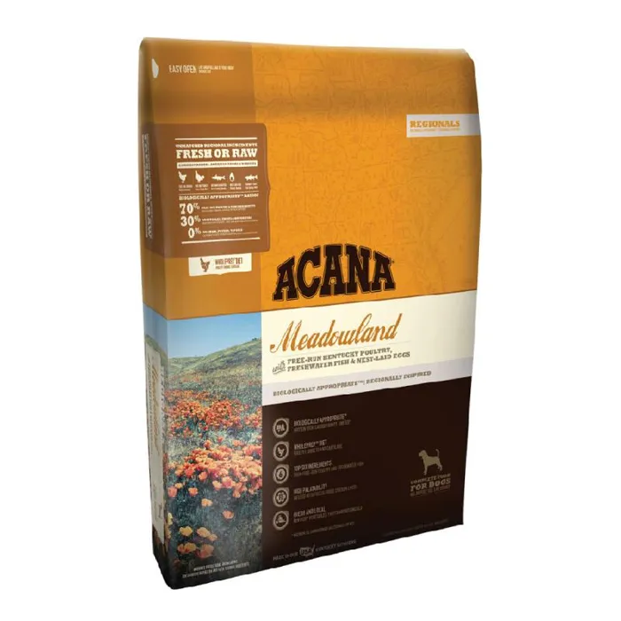 Our ACANAยฎ foods always goes beyond the 1st ingredient, thoughtfully crafting our recipes from start to finish. With a recipe blend inspired by Kentuckyโs fertile lands, ACANA Meadowland is crafted with 70%* quality animal ingredients like free-run chicken and turkey, wild-caught and sustainably farmed fish, and 30%+ fruits, vegetables, and botanicals, many delivered daily. Artificial colors, flavors or preservatives are never added in our kitchen. Our premium ingredients come from a curated group of farmers, ranchers and fishers weโve known and trusted for decades, and we approach every batch with an unsurpassed commitment to safety and quality in our award-winning Kentucky kitchen. The result is a protein-rich, nutritious, and delicious dog food to help them live a healthy, happy life. *approximate and derived from the unprocessed state of the ingredients. +we also add vitamins, minerals, natural preservatives and probiotics