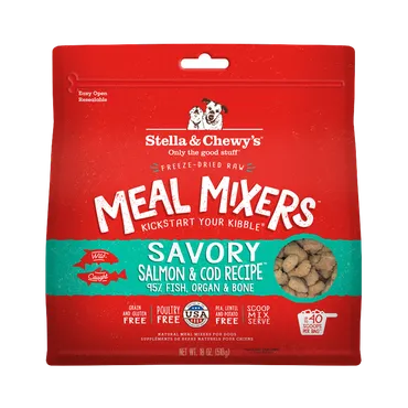 -Made in the USA - Savory Salmon & Cod Meal Mixers' all-natural recipe is crafted with care in small batches in Stella & Chewy's own USA kitchen to provide the highest levels of protein-rich meat and quality grain-free nutrition for your pet