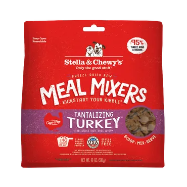 Kickstart Your Kibble! Dogs naturally crave meat, much like they ate in the wild. That's why every batch of Tantalizing Turkey Meal Mixers starts with 95% cage-free turkey, organs and bone plus 100% organic certified fruits and vegetables to guarantee your pet is eating as nature intended. Every recipe from Stella & Chewy's is grain-free and minimally processed. All ingredients are sustainably sourced, and NEVER from China. Add a scoop to your dog's kibble for a boost of real freeze-dried raw food nutrition and taste