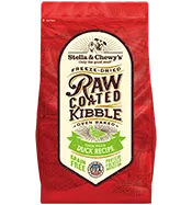 Stella & Chewyโs Raw Coated Baked Kibble provides a best-in-class solution for those pet parents looking for a simple, pristine, less processed, and highly palatable kibble. Each high-protein, grain-free offering starts with responsibly sourced animal proteins (cage-free poultry, grass-fed beef, and wild-caught fish). Next, they gently bake their kibble. Finally, each and every piece is coated with special raw goodness! The result is a special combination of pure raw nutrition and great taste that dogs are wild about!