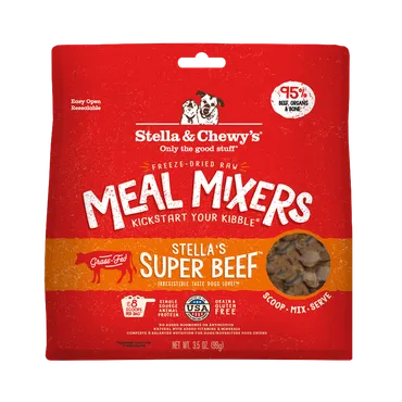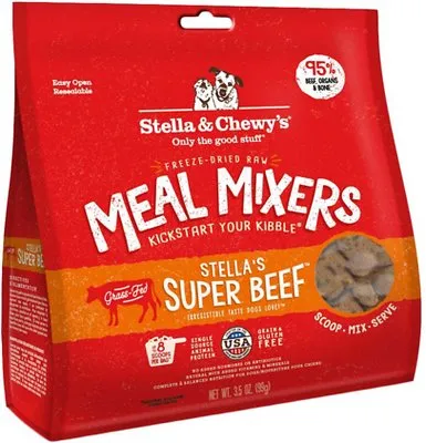 Kickstart Your Kibble! Dogs naturally crave meat, much like they ate in the wild. That's why every batch of Stella's Super Beef Meal Mixers starts with 95% beef (always grass-fed!), organs and bone plus 100% organic certified fruits and vegetables to guarantee your pet is eating as nature intended. Every recipe from Stella & Chewy's is grain-free and minimally processed. All ingredients are sustainably sourced, and NEVER from China. Add a scoop to your dog's kibble for a boost of real freeze-dried raw food nutrition and taste