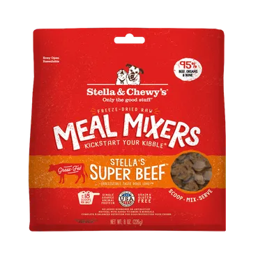 Kickstart Your Kibble! Dogs naturally crave meat, much like they ate in the wild. That's why every batch of Stella's Super Beef Meal Mixers starts with 95% beef (always grass-fed!), organs and bone plus 100% organic certified fruits and vegetables to guarantee your pet is eating as nature intended. Every recipe from Stella & Chewy's is grain-free and minimally processed. All ingredients are sustainably sourced, and NEVER from China. Add a scoop to your dog's kibble for a boost of real freeze-dried raw food nutrition and taste