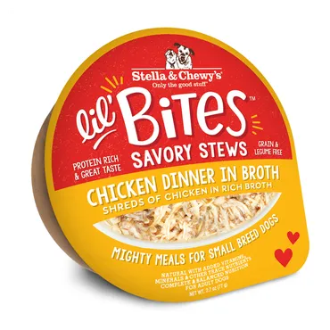 Your canine companion will go head over paws for Stella & Chewy's Lil Bites Savory Stews Grain-Free Chicken in Broth Flavored Shredded Small Breed Wet Dog Food! This protein-rich recipe features shredded and minced meats in a whisker-licking broth. Specially crafted for small breed dogs, itโs crafted with a few wholesome ingredients and the optimal level of vitamins, minerals, omega-fatty acids and taurine to help your little buddy thrive!
