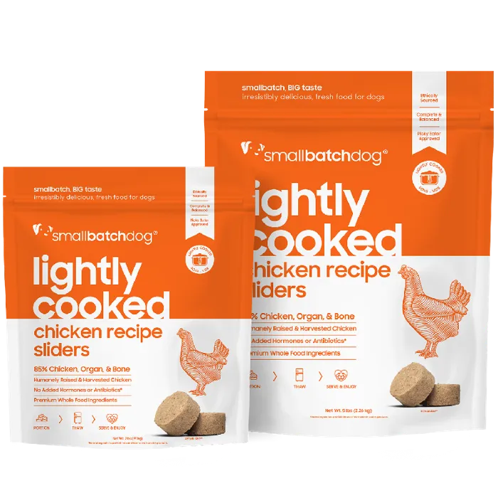 Only made with the highest quality organic non-GMO ingredients for the freshest and most nutritious raw meals that your pet will love! Smallbatch's raw diets use a limited-ingredient single-protein formula featuring 78-88% meat, organ and bone. Only made with meat that is humanely USA-sourced and antibiotic and hormone-free. Smallbatch proudly features no mechanically separated meat. All essential vitamins, minerals, and amino acids come from organic wholefood sources. Smallbatch's new Lightly Cooked line offers the same pure raw diet your pets love that is lightly cooked sous vide style that is gentle and easily digestible for sensitive tummies. Each batch is placed in a water bath and gently cooked to ensure pasteurization for sensitive stomachs. Features convenient individual sliders for easy feeding and portion control! Your dog will be licking their lips after tasting theses delicious raw diets! No Root Vegetables. Made in USA. Smallbatch is a trusted family-owned company that is proudly hand-chosen by the Pet Beastro!