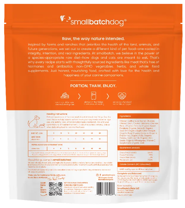 All of Smallbatch's ingredients are carefully selected to meet the standards they feel every pet deserves: organic herbs and vegetables, hormone and antibiotic free meats, and only pure honest supplements such as organic kelp and bee pollen.