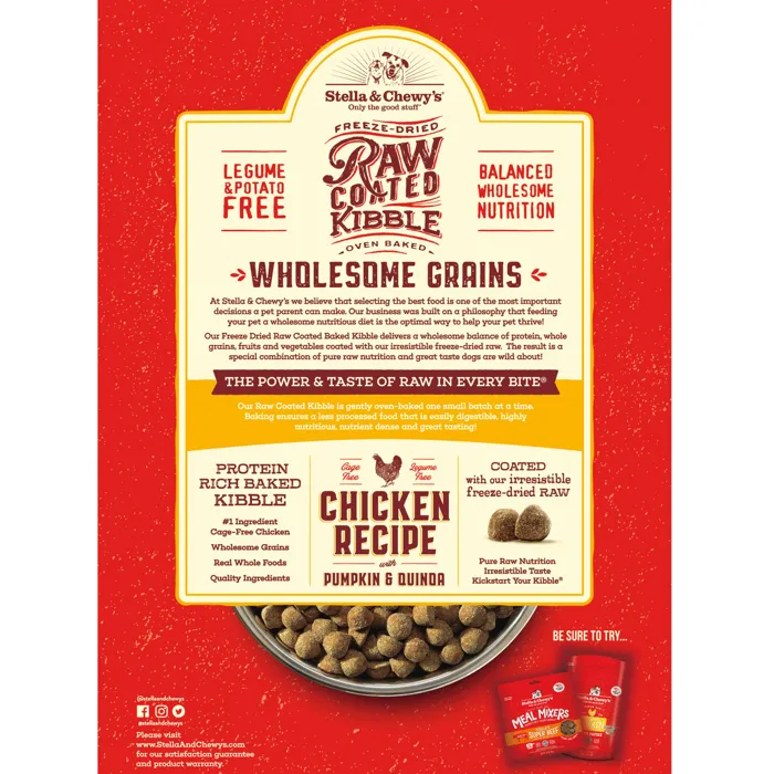 Stella & Chewyโs Freeze Dried Raw Coated Baked Kibble delivers a wholesome balance of protein, whole grains, fruits and vegetables coated with our irresistible freeze-dried raw. Raw Coated Kibble is gently oven-baked one small batch at a time. Baking ensures a less processed food that is easily digestible, highly nutritious, nutrient dense and great tasting. The result is a special combination of pure raw nutrition and great taste dogs are wild about!