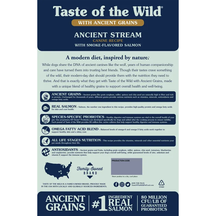 Feed your canine companion a balanced diet with ingredients straight from nature with Taste of the Wild Ancient Stream Smoked Salmon & Ancient Grain Recipe Dry Dog Food! It features sustainably sourced smoked salmon as the number one ingredient, which not only offers your pup a source of high-quality protein, but also omega fatty acids to support healthy skin and a lustrous coat. This recipe is crafted with a combination of whole grains like millet, quinoa, chia seed and sorghum to support your sidekickโs overall health and is completely free of corn, wheat, filler and artificial flavors, colors and preservatives!