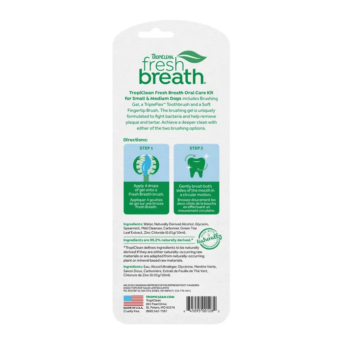 Oral care is about more than making your pets smiles sparkleits an important component of their overall health. In fact, 80% of dogs begin to show signs of oral disease by age 3. Our TropiClean Fresh Breath Oral Care Kit includes our TripleFlex Toothbrush, Finger Brush and our Brushing Gel for Dogs. Our Brushing Gel for Dogs is infused with a unique blend of ingredients that helps remove plaque and tartar and clings to their teeth for a superior clean. Our TripleFlex Toothbrush cleans 3x faster with its easy 360-degree bristles. Also included is our Finger Brush which allows you to gently clean helping remove plaque and tartar. Clean teeth, healthy mouth, happy dog. Size Breed Size