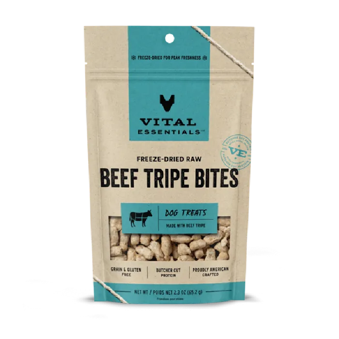 Now you don't have to feel guilty about rewarding your dog with a treat! Vital Essentials Beef Tripe Freeze-Dried Raw Dog Treats are packed with vital nutrients. Made with only fresh, whole, single-sourced USDA beef, these morsels provide essential nutrition and taste that dogs instinctively crave. A slow, 48 hour freeze-drying process locks in nutrients without cooking the raw meat and allows these treats to be safely and conveniently stored without refrigeration. Your dog will be howling for more!