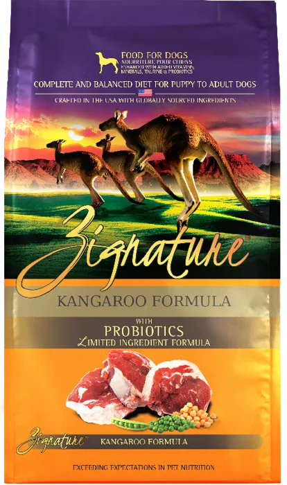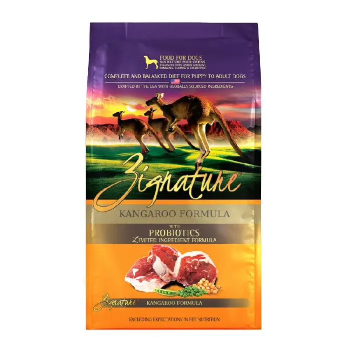 Fill your best friend's bowl with wholesome nutrition when you feed them Zignature Kangaroo Limited Ingredient Formula Grain-Free Dry Dog Food. Your pup will enjoy a delicious dinner made with real, Kangaroo from Australia, wholesome peas, chickpeas, and flaxseed. This meat-first recipe offers pups the protein they need to thrive, while Zignature's limited ingredient recipe throws out troublesome ingredients like chicken, corn, wheat, soy, and potatoes, creating peak hypoallergenic, low-glycemic nutrition. Combine that with key antioxidants, essential fatty acids, and a complete spectrum of vitamins and minerals for a well-rounded meal that goes beyond nature to become your pet's signature food for life.