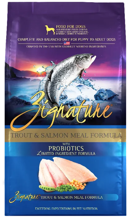 Fill your best friend's bowl with wholesome nutrition when you feed them Zignature Trout & Salmon Meal Limited Ingredient Formula Grain-Free Dry Dog Food. Your pup will enjoy a delicious dinner made with real Trout and Salmon from the Northwestern USA, wholesome peas, chickpeas, and flaxseed. This meat-first recipe offers pups the protein they need to thrive, while Zignature's limited ingredient recipe throws out troublesome ingredients like chicken, corn, wheat, soy, and potatoes, creating peak hypoallergenic, low-glycemic nutrition. Combine that with key antioxidants, essential fatty acids, and a complete spectrum of vitamins and minerals for a well-rounded meal that goes beyond nature to become your pet's signature food for life.